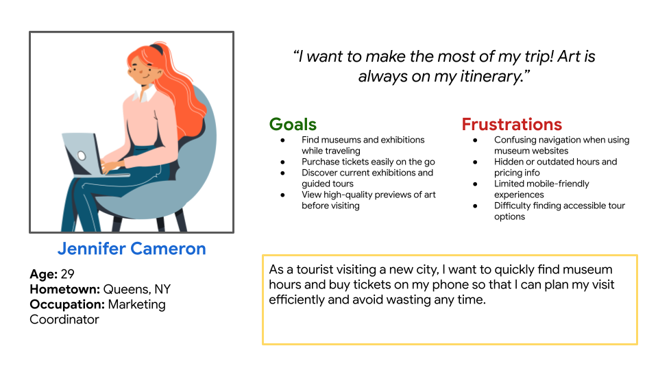 Jennifer’s persona highlighted the importance of creating an intuitive, modern experience for young professionals who want to explore art and events in their limited free time. Her needs reminded me to design with efficiency in mind—making sure information is easy to scan, schedules are clear, and booking a visit feels effortless. This focus helped me craft a sleek and user-friendly design that fits her fast-paced lifestyle.